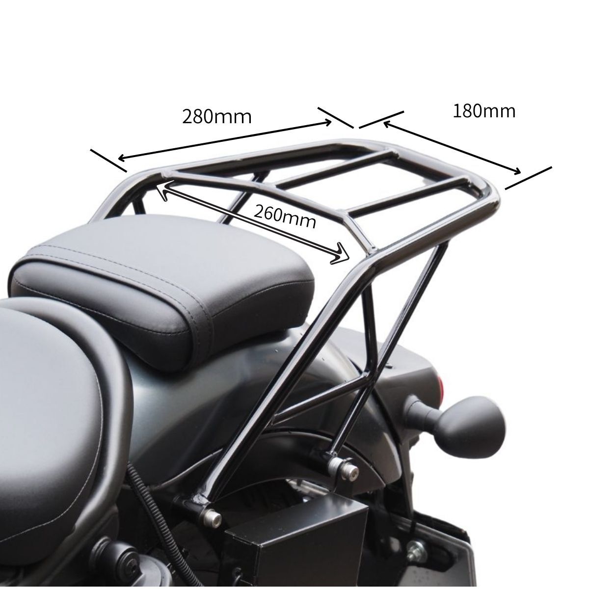 CBR250R系の単気筒エンジンを搭載しABS付でも車体重量170kgと軽量ながら剛性のある足回りとフレームを備えエンジンを回せば軽快に走るレブル250。CBR400Rや400Xの海外モデルCBR500Rや500X系のエンジンを搭載し低回転域でも充分なトルクを確保しつつエンジンを回せば高回転域で伸びのある走りをするレブル500。 この二台はフレームはもちろんのこと、車体を構成するパーツのほとんどを共通としている兄弟モデルとしてリリースされました。どちらのモデルも町乗りから高速道路まで軽快に走行することができるのでツーリングには最適な一台です。 既にリリースしているレブル250/500用サドルバッグサポートはご好評頂いておりますが、更に積載能力を上げるリアキャリアファットバー タイプ 22mm を開発しました。HONDA:レブル250 [MC49 2017-]・レブル500 [PC60 2017-]