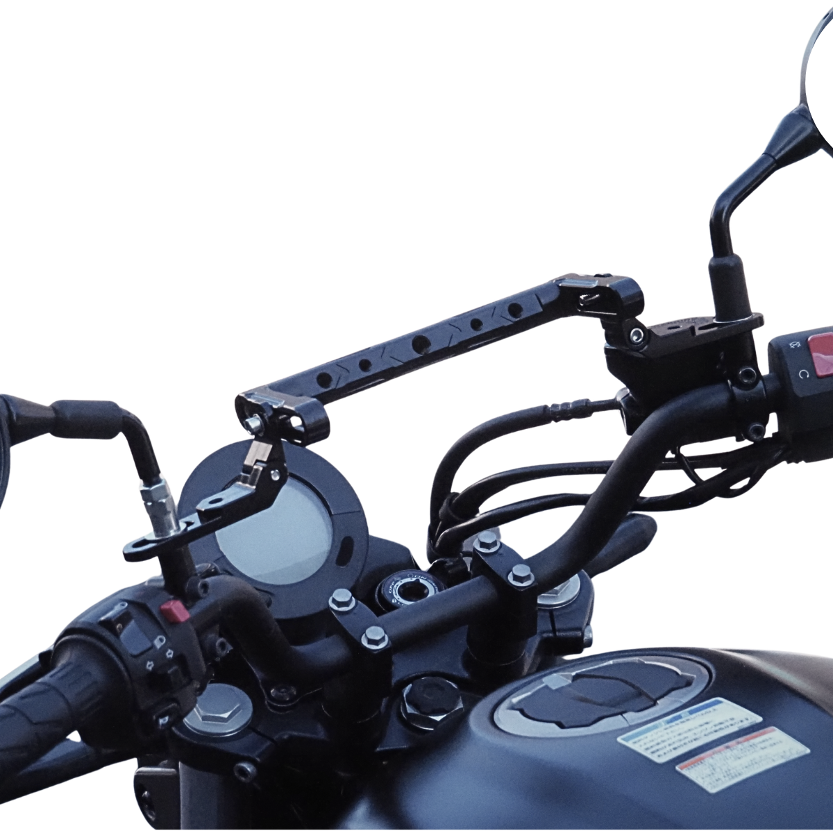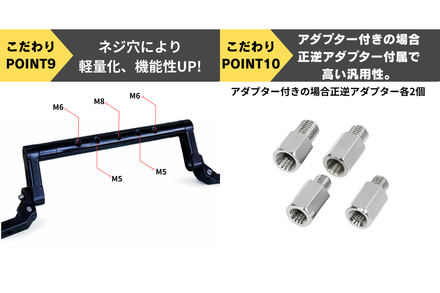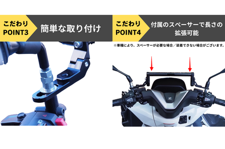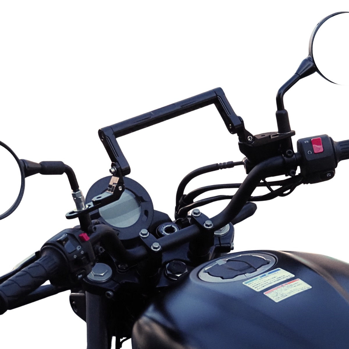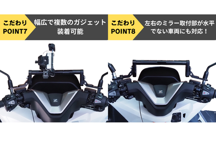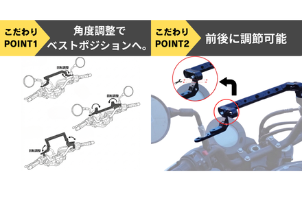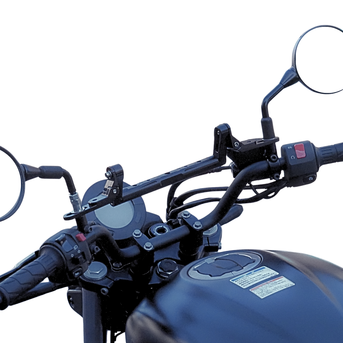 ミラーにマウントするタイプのクランプバーが登場サイズは22.2Φ。 前後と角度が調整可能な仕様なので、好きな位置に調整可能。 左右のミラーの取り付けネジの中心間距離が340~420mmまで取り付け可能です。 アルマイト仕上げの高級感のある材質はお手軽なドレスアップのアイテムとしても活躍するはずです。